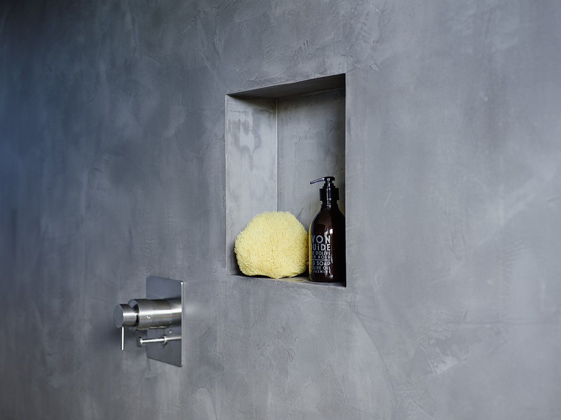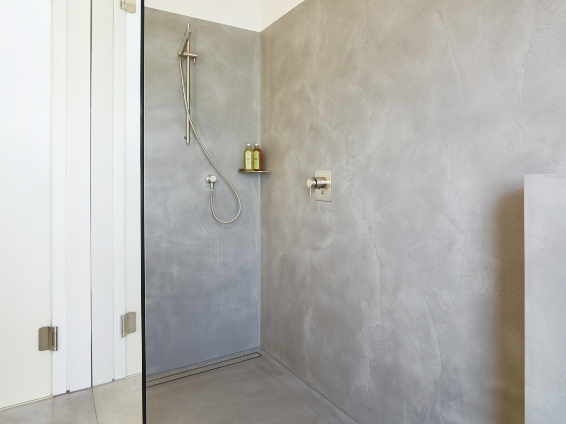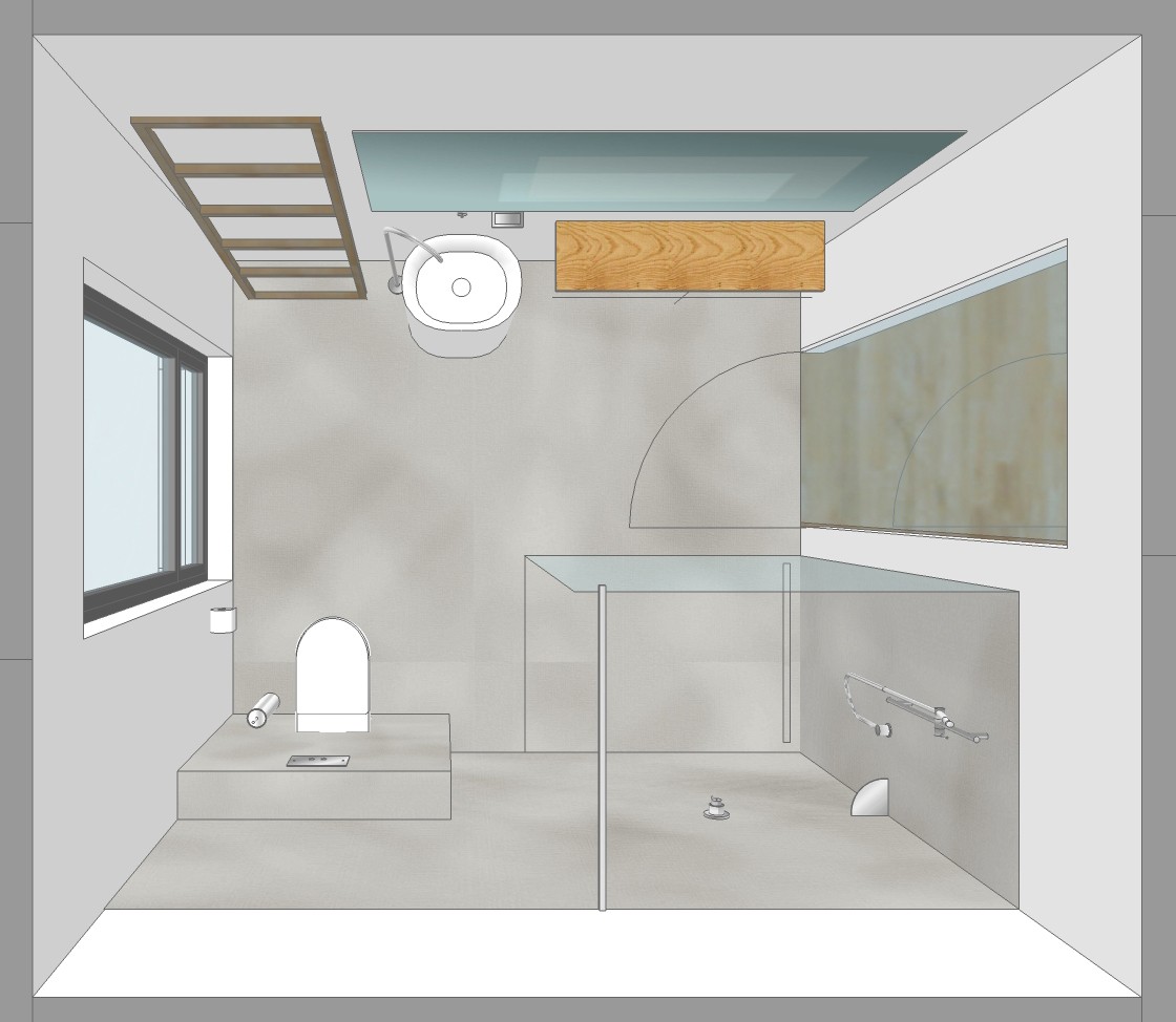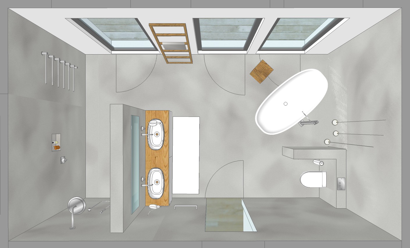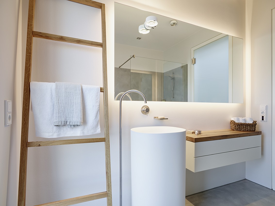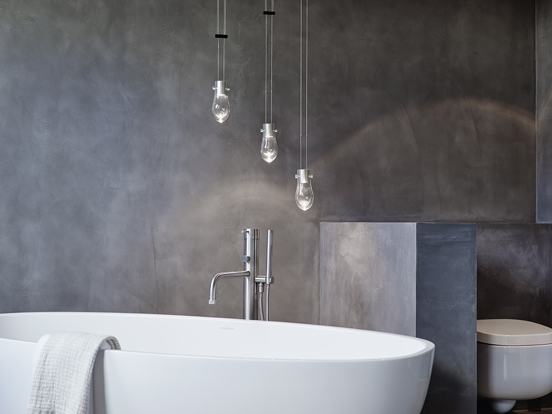 Das Badezimmer ist ein wahr gewordener Wohntraum für jeden Designfan und eine private Wellnessoase, die zum Entspannen einlädt. Die bodentiefen Fenster fluten den Raum mit natürlichem Licht, über der freistehenden Badewanne bringt eine elegante Leuchtenkonstruktion Persönlichkeit ins Spiel. Boden und Wände wirken durch das fugenlose Grau besonders modern und stylish. Neben der Wanne haben wir noch eine große, ebenerdig begehbare Duschnische und einen praktischen Doppelwaschtisch mit viel Stauraum eingeplant. Badplanung wie sie Spaß macht.