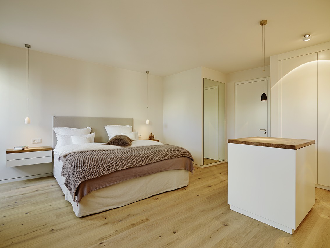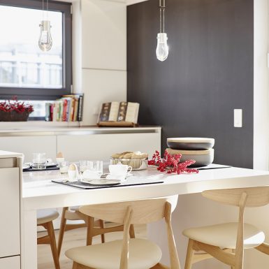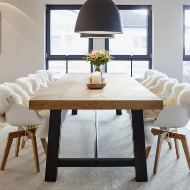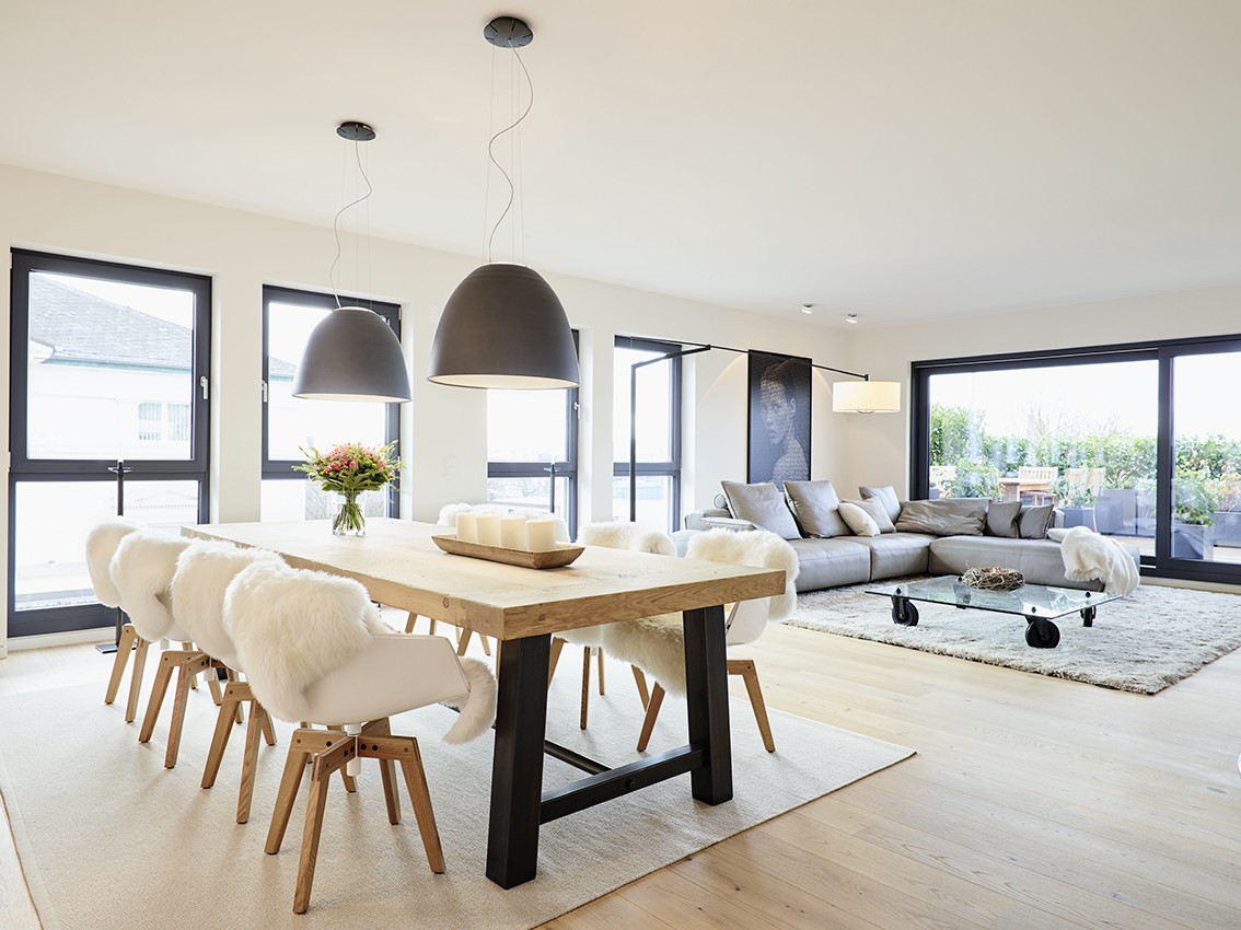 Penthouse Esstisch hängend Loft Lichtplanung Parkett modern hell wohnlich Atmosphäre