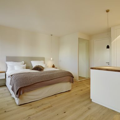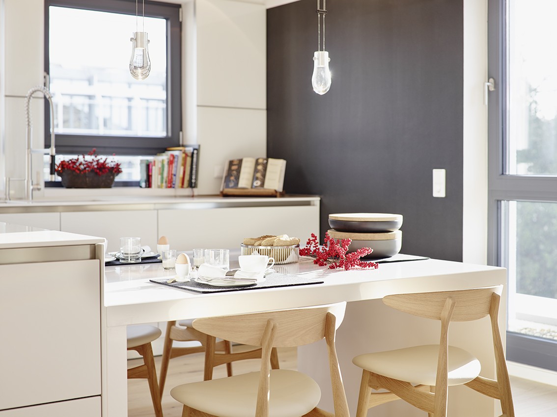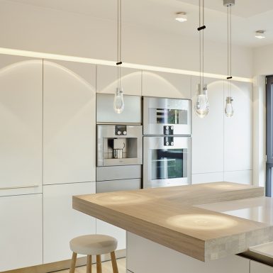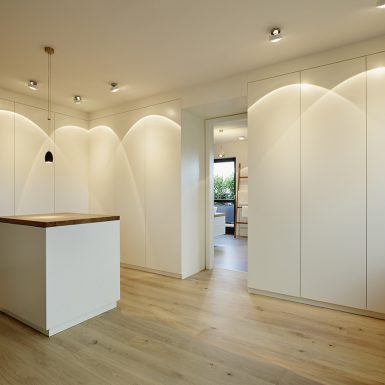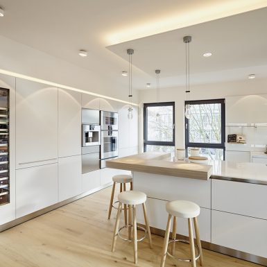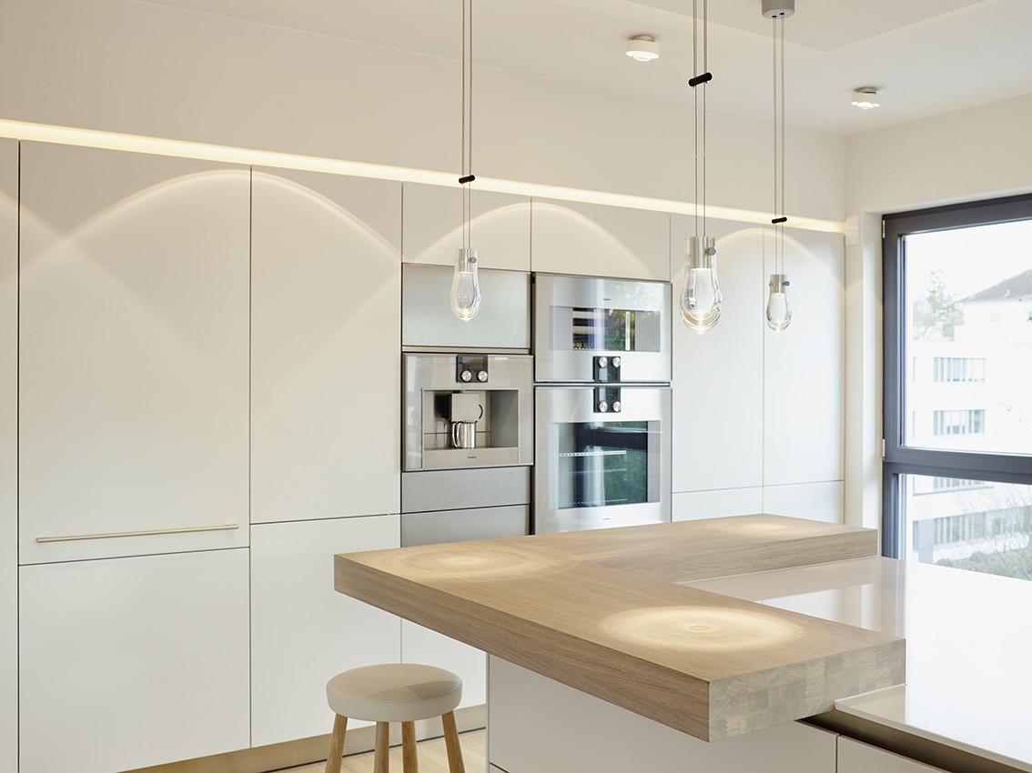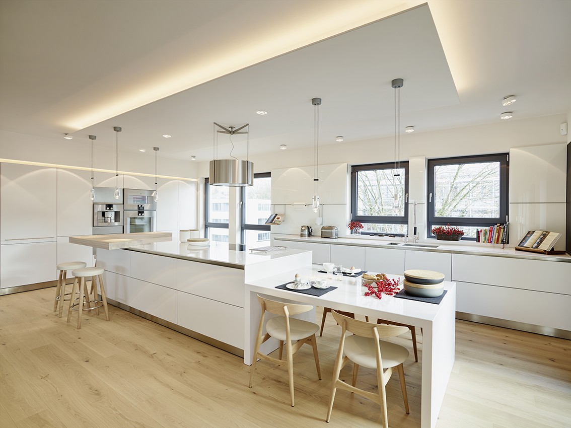 Penthouse Küche Insel weiß Licht Kamin hängend Loft Lichtplanung Parkett modern hell wohnlich Atmosphäre